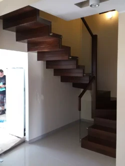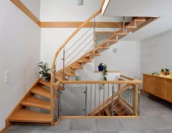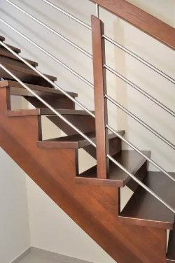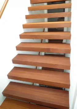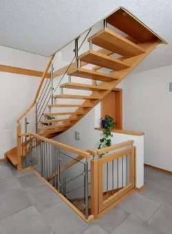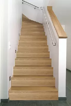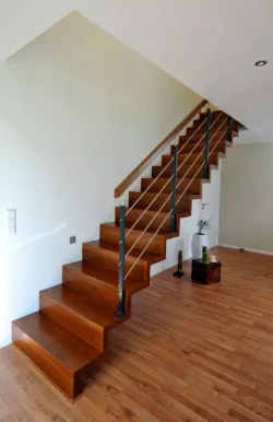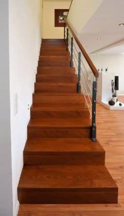 • Die Stufen von hochwertigen Innentreppen stellen wir in der Regel aus Harthölzern her, üblicherweise findet hier massives Buchenholz Verwendung, andere klassische Stufenhölzer sind z. B. Eiche, Ahorn und Nussbaum, mittlerweile auch ausländische Hölzer wie Teakholz oder das sehr wetterbeständige Bangkirai.